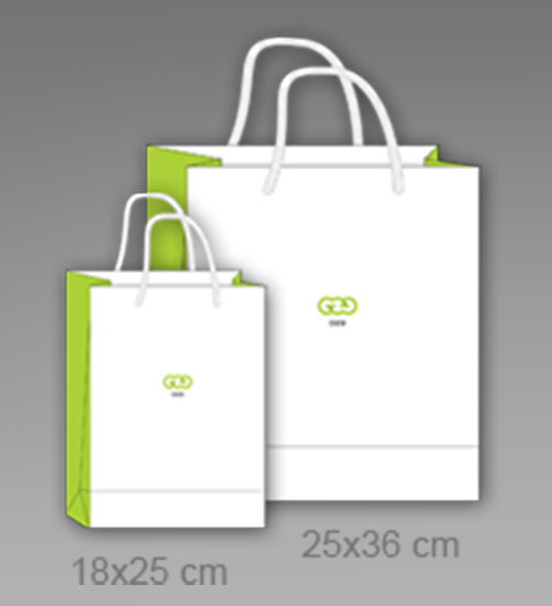 Popierinių maišelių rankenėlės: virvelės baltos arba juodos spalvos, standartinės.